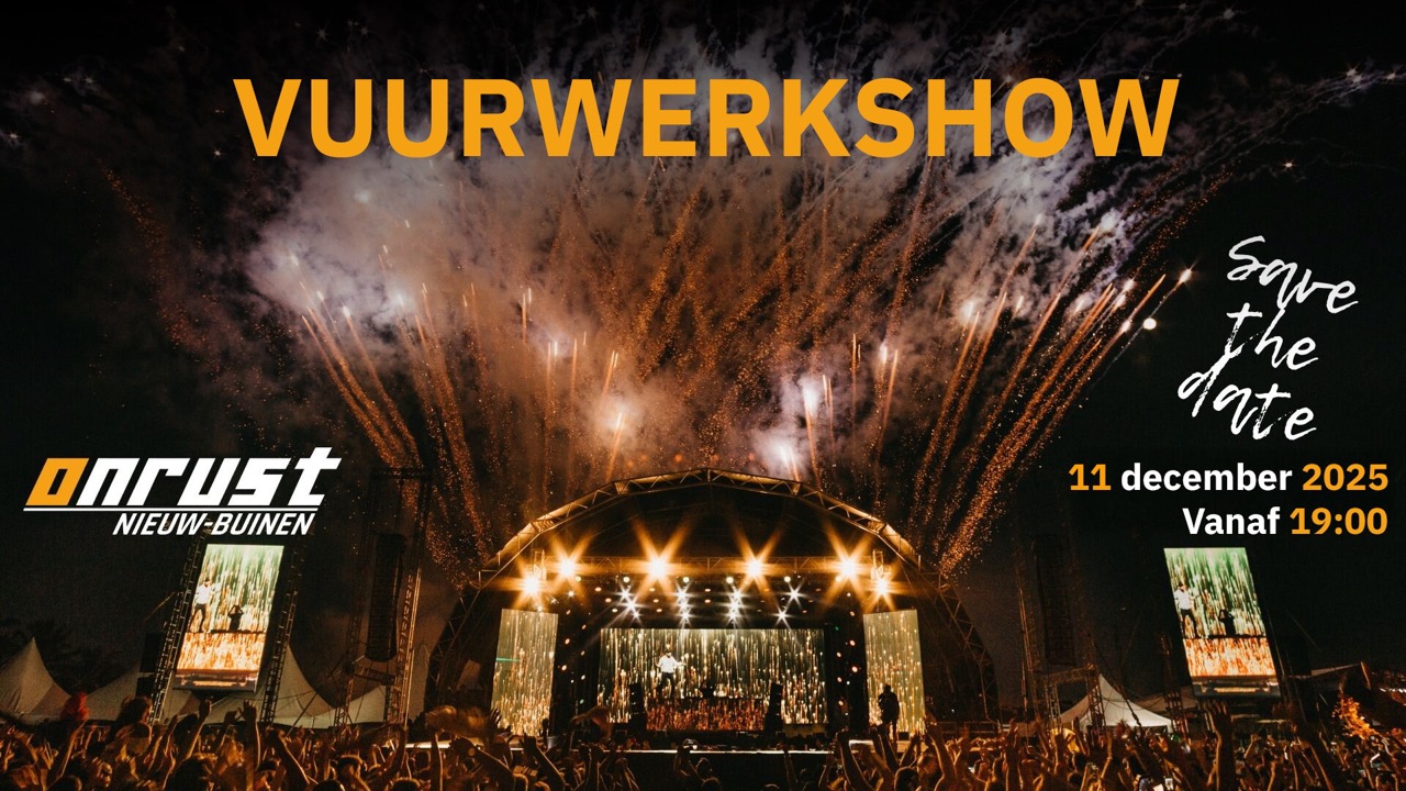 Het aftellen is begonnen: op 11 december 2025 vanaf 19.00 uur barst het los bij Onrust in Nieuw-Buinen. We pakken dit jaar groter uit dan ooit, want dit zou zomaar eens de allerlaatste vuurwerkshow kunnen zijn. Door nieuwe wet- en regelgeving hangt er veel onzekerheid boven de toekomst van consumentenvuurwerk. Dus… grijp uw kans om nog één keer die spectaculaire sfeer en knallende show van dichtbij mee te maken!